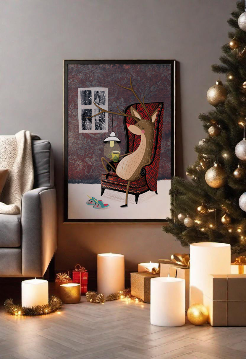 This art print is perfect for those who adore Christmas with reindeers. Whether you're decorating your living room or looking for a unique Christmas gift, this reindeer drawing is sure to bring a smile to anyone’s face. It's reindeer decor that’s not just festive but also full of character.