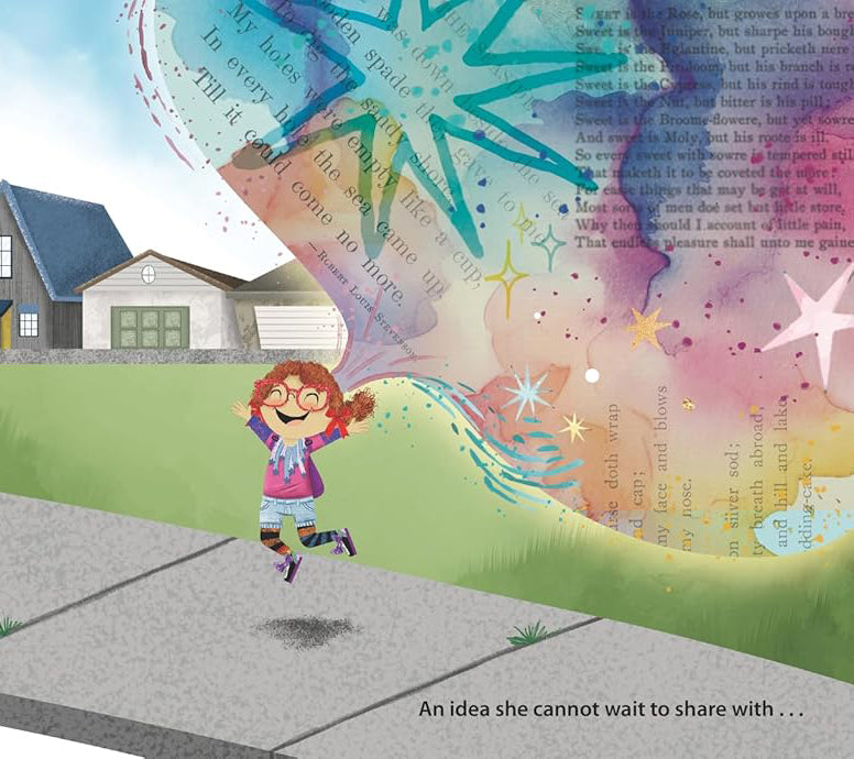 Ruthie Rose wakes up with an idea. A big, bright, beautiful idea. An idea so great! An idea so grand! Ruthie Rose can’t wait to share it with her idea-loving librarian, her art teacher, and her best friend. As the idea gets shared, it sparkles through her classmates, shouts down the hallway, and echoes over the playground. It invites everyone in the school, including YOU. John Schu’s effervescent prose is complemented by Holly Hatam’s vibrant artwork in clear, vivid colours, depicting a cast of adorable characters. Collaged throughout the artwork are intriguing snippets of language and lines from classic poems, sure to inspire young poetry lovers to discover more.