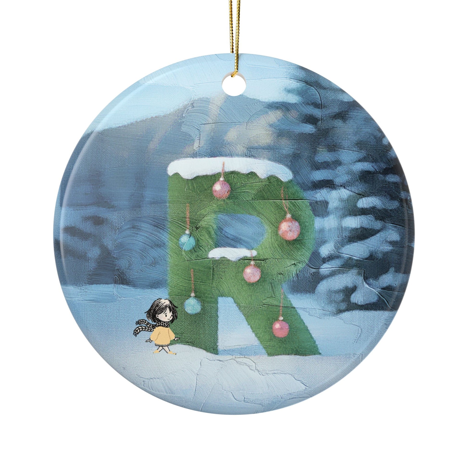 Yellow Jacket Girl Monogram Ornament | Ceramic round ornament, two-sided print | Letter R