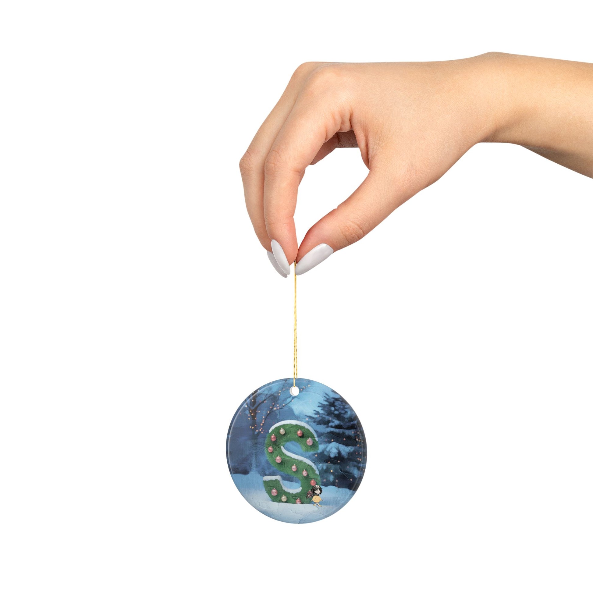 Yellow Jacket Girl Monogram Ornament | Ceramic round ornament, two-sided print | Letter S
