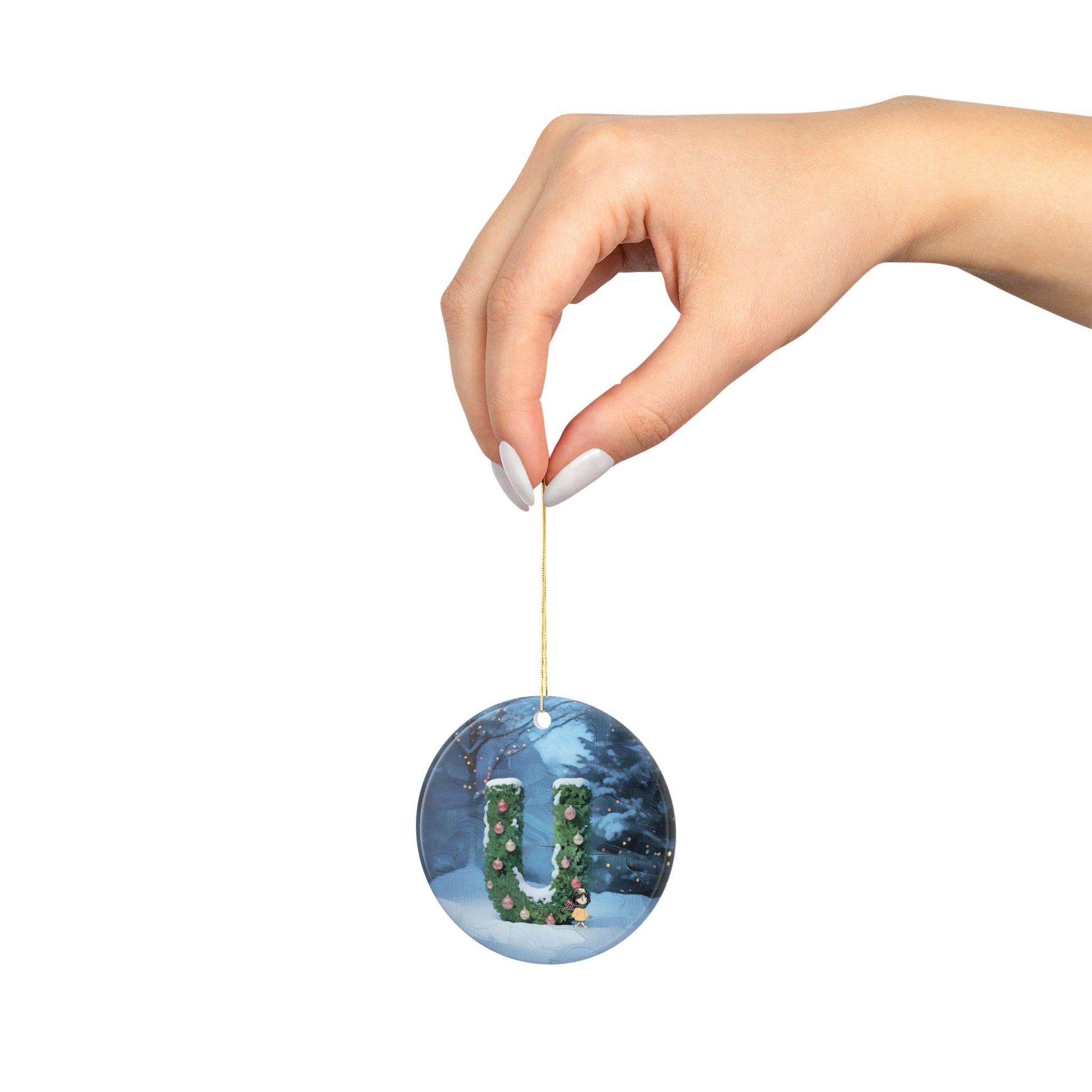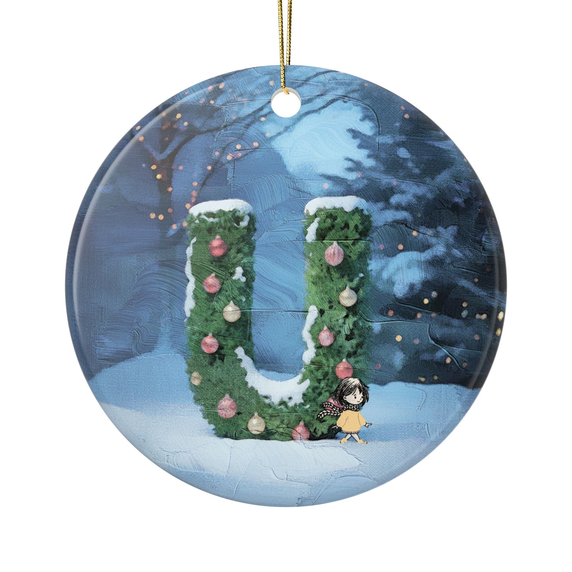 Yellow Jacket Girl Monogram Ornament | Ceramic round ornament, two-sided print | Letter U