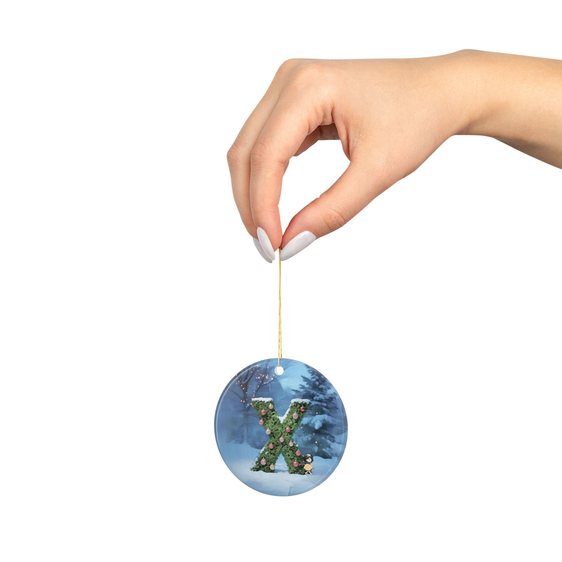 Yellow Jacket Girl Monogram Ornament | Ceramic round ornament, two-sided print | Letter X